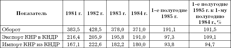 Как видно из табл. 2, товарооборот между КНР и КНДР, несколько варьируясь, в целом не вырос за последние годы. В 1984 году он был немного ниже, чем в 1981 году, в 1985 году, видимо, вернется к уровню 1981 года. Экспорт КНР сокращался, а импорт возрастал (в 1985 г. наблюдается обратное явление), но при этом китайский экспорт во все годы (за исключением 1982 г.) превышал импорт КНР из КНДР.