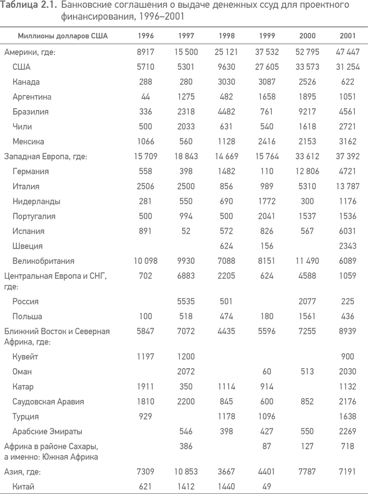 Как можно заметить на основании данных, представленных в табл. 2.1, банковская деятельность по проектному финансированию в основном концентрируется в Северной и Южной Америках (особенно в США) и Западной Европе. В связи с последними изменениями на наиболее активных рынках проектного финансирования можно сделать следующие выводы.