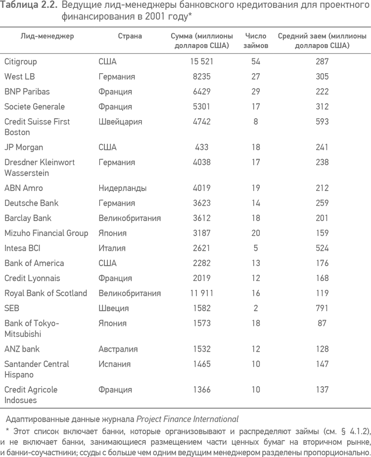 В 2001 году всего 123 банка были лид-менеджерами при кредитовании проектного финансирования, большинство из них работают совместно в банковских группах (см. § 4.1.50). Сравнивая показатели для 20 топ-банков в табл. 2.2 с показателями, которые приведены в табл. 2.1, можно сделать вывод, что эти банки с объемом сделок на сумму 80 миллиардов долларов США составляют более чем 70 % рынка банковского кредитования для проектного финансирования.