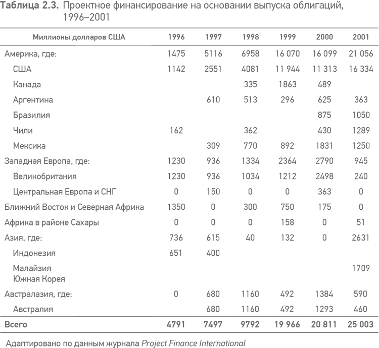 Показатели рынка облигаций, представленные в табл. 2.3, иллюстрируют, что чуть меньше чем 16 миллиардов долларов США из объема всего рынка облигаций для проектного финансирования, в 25 миллиардов в 2001 году были размещены в США. В добавление к этому в США облигационное финансирование также привлекается и для финансирования проектов вне пределов страны, особенно для проектов в Латинской Америке. Показатели роста американского рынка облигаций для проектного финансирования в последнее время в первую очередь отображают продолжающееся снижение спроса на облигации в энергетике.