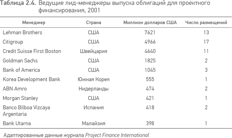 В некоторых других странах существуют развитые национальные рынки облигаций, где инвесторы готовы инвестировать в облигации проектного финансирования; это, например, Канада, Великобритания, Австралия и (в 2001 году) Малайзия и Южная Корея. Как видно из табл. 2.3, процесс развития рынка облигаций для проектного финансирования в Азии тяжело перенес кризис 1997 года. Принимая во внимание американское превосходство на рынке облигаций, не вызывает удивления тот факт, что наиболее активные инвестиционные банки, занятые размещением облигаций проектного финансирования, в основном располагаются в США, с активными операциями – в Нью-Йорке (табл. 2.4). Как видно из сравнения с табл. 2.3, эта «горячая десятка» в табл. 2.4 составляет 90 % всего рынка размещений облигаций в 2001 году.