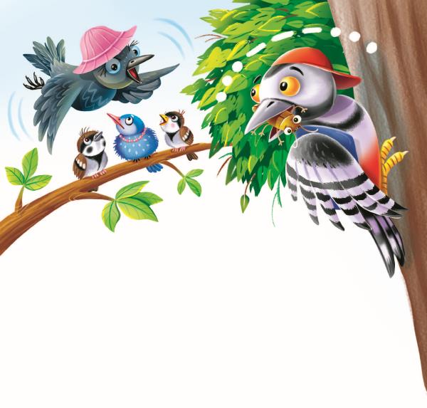 Дятел, который ни на секунду до этого не прекращал барабанить по пню в поисках съестного, чуть жуком не подавился. Он решил не давать себя в обиду и тут же настучал на галку в ответ:
