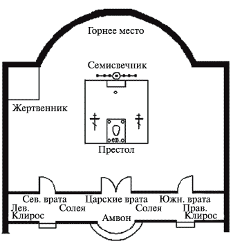 В наши дни в соответствии с древнейшими традициями в восточной стене алтаря с внешней стороны храма устраивается полукружие – апсида. Посредине алтаря помещается святой престол. Вплотную к середине апсиды алтаря против престола сооружается возвышение. В кафедральных архиерейских соборах и во многих приходских храмах на этом месте стоит кресло для епископа как знамение престола (трона), на котором невидимо восседает Вседержитель. В приходских храмах в полукружии апсиды возвышения и кресла может и не быть, но в любом случае место является знамением того Небесного Престола, на котором незримо присутствует Господь, и называется поэтому Горнее место. Горнему месту обязательно кадят во время богослужений; проходя, кланяются, осеняя себя крестным знамением; на Горнем месте непременно возжигается свеча или лампада. Прямо перед Горним местом позади престола помещается обычно семисвечник, который в древности был подсвечником для семи свечей, а ныне чаще всего является разветвленным на семь ветвей от одного высокого столпа светильником, в котором находятся семь лампад, возжигаемых при богослужении. Справа от Горнего места и слева от престола расположен жертвенник, на котором совершается проскомидия. Около него обычно стоит стол для поданных верующими просфор и записок с именами людей о здравии и о упокоении. Справа от престола, чаще всего в отдельном помещении, располагается сосудохранилище и ризница, где хранятся в небогослужебное время священные сосуды, облачение духовенства. Иногда ризница может находиться в отдельном от алтаря помещении. Но в таком случае справа от престола всегда имеется стол, на который полагаются ризы священнослужителей, приготовленные для богослужения. По сторонам семисвечника, с северной и южной сторон престола, принято поставлять на древках выносную икону Божией Матери (с северной стороны) и Крест с образом Распятия Христова (с южной). Справа или слева от престола помещается умывальник для омовения рук священнослужителей перед литургией и омовения уст после нее и место, где возжигается кадило. Перед престолом, справа от Царских врат у южных дверей алтаря, принято ставить кресло для епископа. Алтарь, как правило, имеет три окна, знаменующих несозданный троический свет Божества, или два раза по три (вверху и внизу), или три вверху и два внизу (в честь двух естеств Господа Иисуса Христа), или четыре (во имя Четвероевангелия). Алтарь по причине совершаемого в нем Таинства Евхаристии как бы повторяет собою ту прибранную, устланную, готовую горницу, где состоялась Тайная вечеря, поэтому он содержится в особенной чистоте, устилается коврами, по возможности всячески благоукрашается.