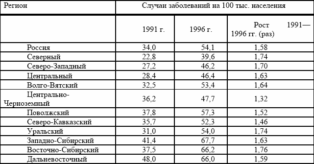 Неблагоприятные тенденции в заболеваемости туберкулезом, в том числе туберкулезом легких, продолжались и в 1996 г. В целом по России заболеваемость выросла на 9,4 %. При среднем по России показателе заболеваемости туберкулезом детей 11,5 в 1995 г. и 12,6 в 1996 г. на 100 тыс. детского населения. Эти показатели в ряде регионов значительно выше и составляют в республиках Бурятия (соответственно 43,0 и 56,7), Алтай (28,0 и 31,6), Якутия (46,7 и 46,6), Тыва (82,8 и 89,9), Северная Осетия (55,4 и 65,6), Магаданской (31,8 и 61,4) и Камчатской (99,1 и 131,4) областях. Резко возрос показатель инфицированности детей – 2,5 % (вираж туберкулиновой реакции), который при благополучной ситуации не превышает 0,1 %.