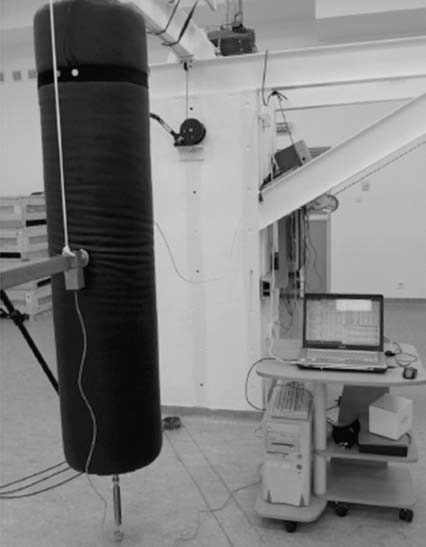 Другой тренажер для ударных единоборств разработан в Варшавском институте спорта [22]. Версия BTS-3 снабжена динамометрической грушей со встроенным тензодатчиком. Груша подвешена на нескольких стабилизирующих канатах. Два сигнальных диода, обозначающих последовательность ударов, закреплены на верхней цилиндрической части груши. Управление осуществляется специальной программой. Устройство измеряет результирующую силу реакции в плоскости, перпендикулярной цилиндрической оси груши, а также направление приложения силы при одиночном ударе или серии ударов. Груша может также использоваться для имитации боксерского боя (рис. 2).