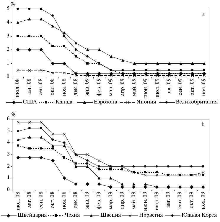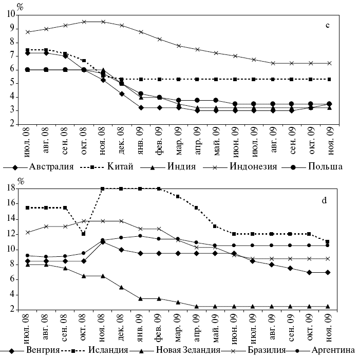 Необходимо отметить, что практически все страны в борьбе с мировым финансовым кризисом обратились к использованию такого макроэкономического инструмента, как ставка рефинансирования. Подавляющее большинство центральных банков для стимулирования процесса кредитования реального сектора экономики последовательно снижали уровень базовой ставки, а также выделяли дополнительные средства на программы кредитования с целью опять-таки снизить ставки по кредитам, особенно по ипотеке. В некоторых странах ставка доходила почти до нулевой отметки – в Японии (до 0,1 %), США, Канаде, Швейцарии, Швеции (до 0,25 %), Великобритании (до 0,5 %). Швеция во второй половине 2009 г. первой в мире установила отрицательные процентные ставки по депозитам банков. По пути повышения своих базовых ставок в период разрастания финансового кризиса для предотвращения массового оттока капитала пошли Венгрия, Исландия, Белоруссия, Россия, Бразилия, Аргентина, Индонезия, но и эти страны в первом полугодии 2009 г. на фоне появления первых признаков стабилизации финансовой системы стали активно снижать базовые ставки. Из стран, которые длительное время удерживали учетные ставки национальных банков на предельно низком уровне, Австралия и Норвегия стали первыми, кто уже в октябре 2009 г. вновь начал их повышать (рис. 1).