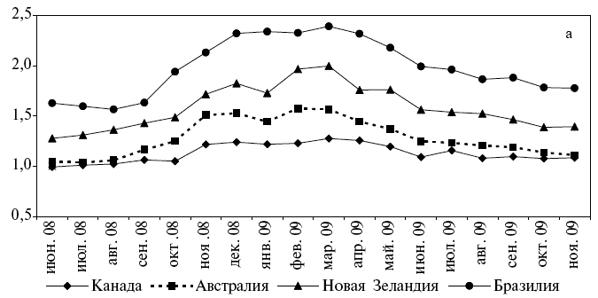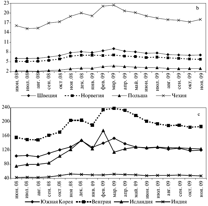 Для повышения конкурентоспособности своей продукции и стимулирования экспорта некоторые страны (особенно в Восточной Европе и СНГ) снизили курс национальных валют относительно доллара США и евро (рис. 2), хотя впоследствии начался обратный процесс укрепления валют (Венгрия, Польша).