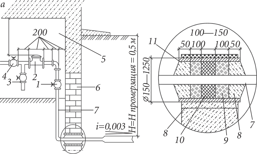 Рисунок 1. Схема водопроводного ввода (размеры указаны в миллиметрах): а – индивидуальный дом; 1, 4) вентиль; 2) водомер; 3) сливной кран; 5) подвал; 6) фундамент; 7) трубопровод ввода; 8) цементный раствор; 9) пакля; 10) жирная глина; 11) канал