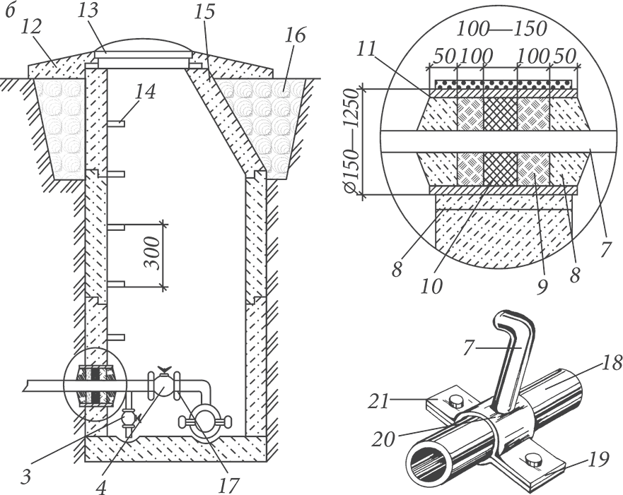 Рисунок 1. Схема водопроводного ввода (размеры указаны в миллиметрах) (окончание): б – уличный водоразборный колодец; 4) вентиль; 3) сливной кран; 7) трубопровод ввода; 8) цементный раствор; 9) пакля; 10) жирная глина; 11) канал 12) отмостка; 13) люк; 14) скобы; 15) бетонное кольцо; 16) глиняный замок; 17) заземление; 18) труба уличного ввода; 19) прокладка; 20) сварка; 21) хомут