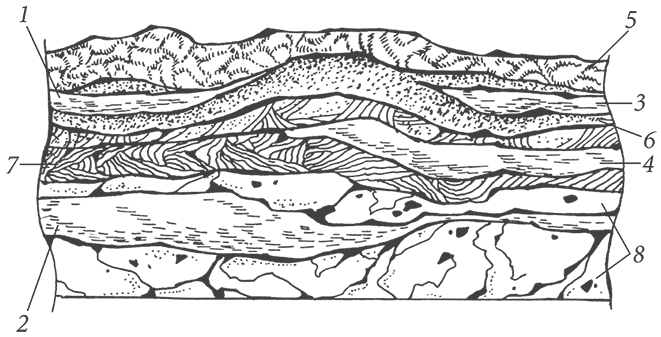 Рисунок 2. Схема образования подземных вод: 1, 3) грунтовые воды; 2) артезианская вода; 4) межпластовые воды; 5) поверхностный слой грунта; 6) песчаный и каменистый слой; 7) глиняный водоупорный горизонт; 8) известняки