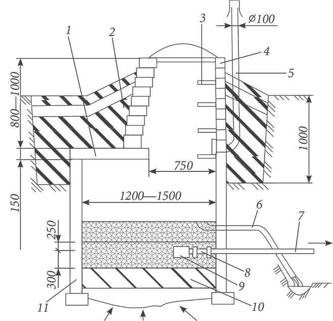 Рисунок 3. Ключевой колодец восходящего типа (размеры указаны в миллиметрах): 1) перекрытие; 2) слой гидроизоляции; 3) ходовые скобы; 4) кирпичная кладка; 5) вентиляционная труба; 6) переливная труба; 7) водозаборная труба; 8) вентиль; 9) фильтр; 10) обратный гравийный фильтр; 11) бетонное кольцо