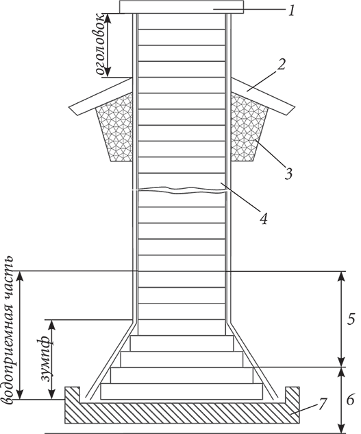 ♦ зумпф, или нижняя часть водоприемного ствола, которая устраивается в тех случаях, когда производительность водоносного горизонта недостаточна. Для сбора воды зумпф располагают ниже водоносного слоя, выполнив его в виде шатра, благодаря чему водоприемная часть колодца значительно увеличивается.