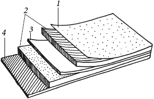Рис. 1. Слои двустороннего рулонного гидроизоляционного материала: 1) верхний защитный слой; 2) два слоя вяжущего вещества или пропитки с обеих сторон основы; 3) основа; 4) нижний защитный слой