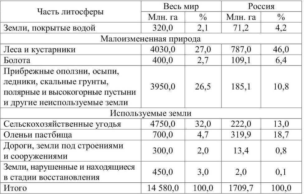 Задание 2. Используя таблицу 1, сравните структуру земельного фонда России и мира. В чем заключаются особенности земельного фонда России? Сравните обеспеченность пашней и другими видами земельных ресурсов различных регионов мира, используя данные таблицы 2. Объясните причины различий.