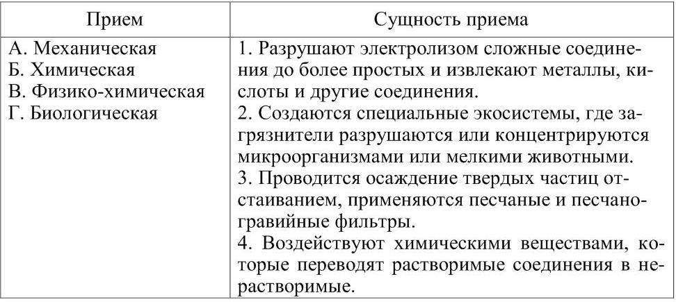 Задание 3. Соотнесите указанные в таблице 3 приемы очистки воды (буквенное обозначение) с процессами, которые происходят при использовании этих приемов (цифровое обозначение) и заполните блоки схемы очистки воды (рисунок 4).
