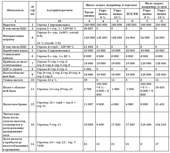 Для начинающих предпринимателей традиционка невыгодна. Посмотрите на таблицу расчета налогов. В строке 14 указана доля налогов в прибыли до налогообложения. В традиционке она составляет 76 %, в других – от 3 до 51 %.