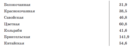 Содержание аскорбиновой кислоты (витамина С) мг% у различных видов капусты
