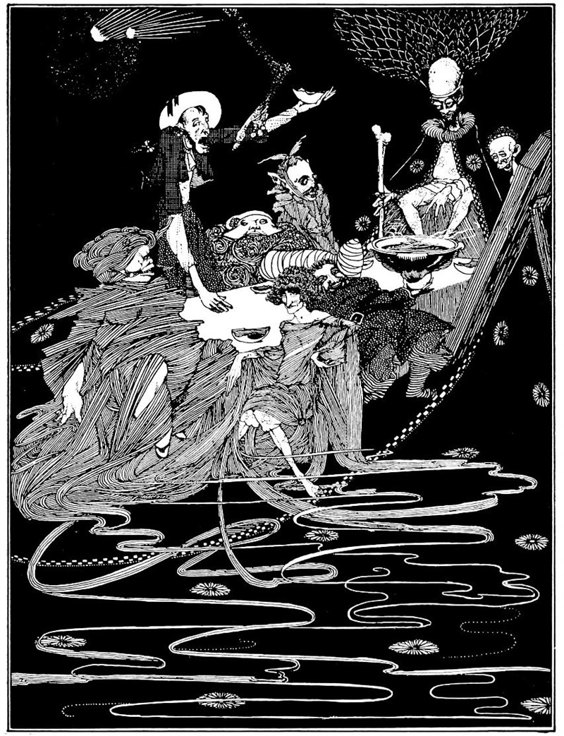 Но длинный председатель, не возмущаясь таким крайне грубым поведением, очень милостиво улыбнулся незваным гостям – величаво кивнул им черными перьями – и, встав, взял каждого из них за руку и отвел к сиденьям, тем временем поставленным для пришедших кем-то из компании. Рангоут не оказал ни малейшего сопротивления, но уселся, как ему указывали; а кавалерственный Хью перенес свои козлы с места в головах стола поближе к маленькой чахоточной барышне в саване, превесело плюхнулся рядом с нею и, налив череп красного вина, залпом осушил его за продолжение знакомства. Окостеневший господин в гробу, казалось, был крайне возмущен таким дерзким поведением; и могли бы возникнуть серьезные последствия, но председатель, постучав по столу, привлек внимание всех присутствующих следующей речью: