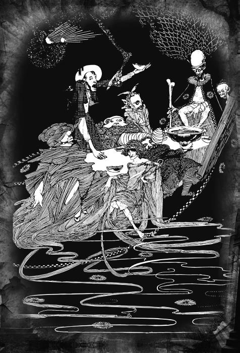 Против входной двери и несколько возвышаясь над своими сотоварищами, восседала фигура, каковая по видимости была председателем праздника. Эта особа была худощава и высока, и Снасти был смущен, увидя фигуру еще более отощалую, чем он сам. Лицо председателя было желто, как шафран – но ничего в нем, кроме одной черты, не было достаточно примечательно, чтобы заслужить подробное описание. Этой одной чертой являлся лоб, столь необычно и отвратительно высокий, что имел он вид колпака или короны из плоти, данной в прибавку к естественной голове. Рот его был собран в складки и играл ямочками в выражении чудовищной любезности, и глаза его, правда как и глаза всех сидевших за столом, были стекловидны от винных паров. Этот джентльмен с головы до ног был одет в богато вышитую гробовую мантию из черного шелкового бархата, небрежно наброшенную вокруг его тела наподобие испанского плаща. Голова его вся была утыкана черными перьями из гробового султана, он ими покачивал из стороны в сторону с веселым и понимающим видом; а в правой руке своей он держал огромную человеческую берцовую кость, которою, как кажется, он только что легонько ударил кого-то из сочленов общества, дабы принудить к песне.