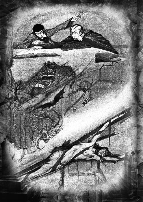 Опустив носилки с телом в этом царстве ужаса, мы приподняли крышку гроба, которая еще не была завинчена, и взглянули в лицо покойницы. И тут поразительное сходство брата и сестры впервые бросилось мне в глаза. Быть может, угадав мои мысли, Ашер пробормотал несколько слов, из которых я понял, что они были близнецами и что между ними всегда существовала какая-то таинственная связь. Впрочем, мы скоро опустили крышку, так как не могли смотреть без ужаса в лицо покойницы. Болезнь, сгубившая ее во цвете лет, оставила следы, характерные для каталептических заболеваний: слабую краску на груди и на щеках и ту особую томную улыбку, которая так ужасает нас, когда человек уже мертв. Мы завинтили крышку, заперли железную дверь и со стесненным сердцем вернулись в верхнюю часть дома, которая, впрочем, казалась немногим веселее.