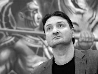 И вот я сижу в окружении цветущей листвы в приемной, волей-неволей ерзаю на светлом диване, настраиваюсь. И тут буквально вбегает он. «Вы по поводу книги? Заходите». Крепкое рукопожатие – и он ринулся в кабинет. Я остался позади и услышал странный звук: резкое металлическое «бах-бах» от соприкосновения медных оркестровых тарелок. В голове появилась пресловутая заводная обезьяна и стала часто-часто стучать в эти тарелки.