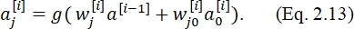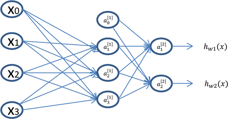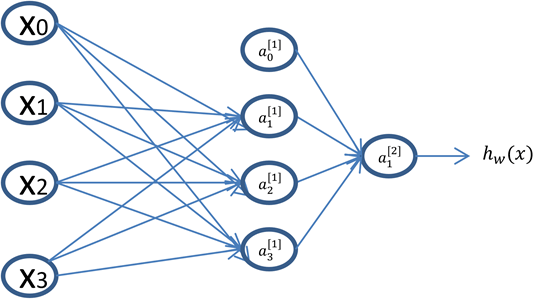 На рисунке входные нейроны обозначены символом х, нейроны скрытого слоя – символами a1[1], a1[1], a2[1], a3[1], a0[1] и выходного слоя – символом a1[2]. Если нейронная сеть имеет несколько слоев, то первый слой называют входным, а последний – выходным. Все слои между ними называются скрытыми. Для нейронной сети с L-слоями выход входного или нулевого слоя нейронов определяется выражением a[0] = x.