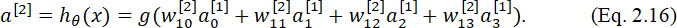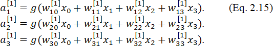 В этом примере (рисунок 2.11) веса нейронной сети будем обозначать символом w, смещения b. Номер слоя, как и ранее, указываем верхним индексом в квадратных скобках для того, чтобы не путать с индексом обучающего примера, номер нейрона в слое – нижним индексом. Выход нейрона по-прежнему обозначаем символом а.