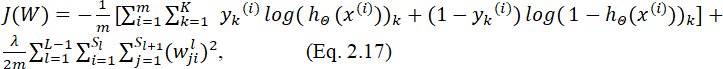 Для настройки весов w нейронной сети (обучения сети) используют функцию стоимости, напоминающую функцию стоимости для логистической регрессии (Eq. 2.12).