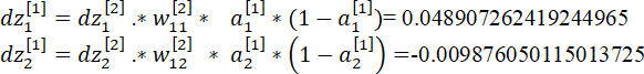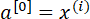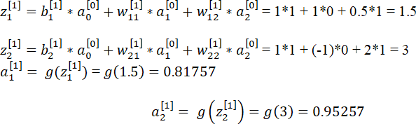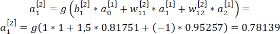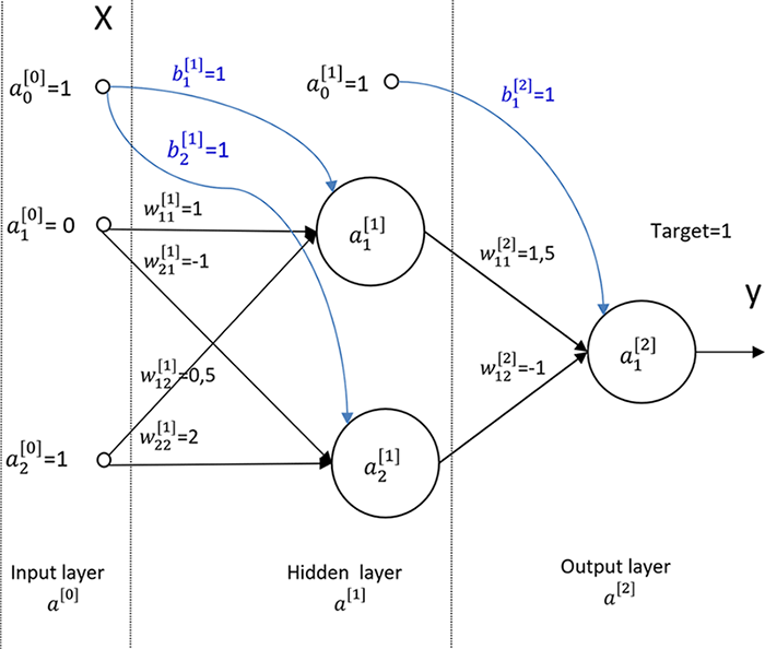 Входной слой с его входами x для единообразия последующих матричных операций обозначаем как нулевой слой – a[0]. В нашем примере x1 = 0, x2 = 1, тогда a1[0] = x1 = 0 и a2[0] = x2 = 1. Смещение (bias) во всех слоях a1[l] = 1.