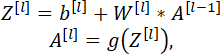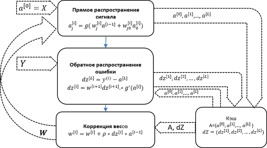 Шаг 1. Выполняем этап прямого распространения сигнала по слоям сети, то есть вычисляем сигнал на выходе сети, выполняя расчет для каждого нейрона в каждом слое, как показано в выражениях 1.4, 1.5. Результаты в виде выходных значений нейронов сети a[0],a[1],…,a[L] сохраняем в промежуточном хранилище (кэш).
