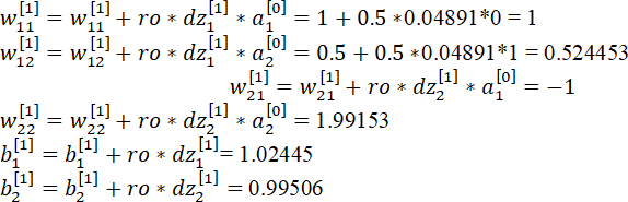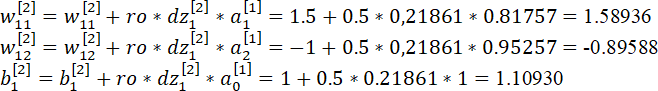 Установим для нашего учебного примера большой коэффициент обучения (learning rate) ro = 0.5. Отметим, что в реальных случаях ro редко превышает 0.1. Здесь мы использовали относительно большое значение, чтобы увидеть значимые изменения весов уже на первой итерации.