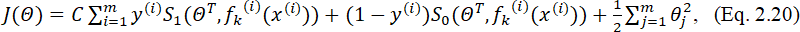 где S1 и S0 – функции, заменяющие log(hθ) и log(1–hθ) в выражении для логистической регрессии (f2) (обычно это кусочно-линейные функции); fk – функция ядра, выполняющая отображение φ и определяющая значимость объектов обучающего множества в пространстве признаков. Часто используется гауссова функция