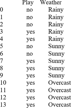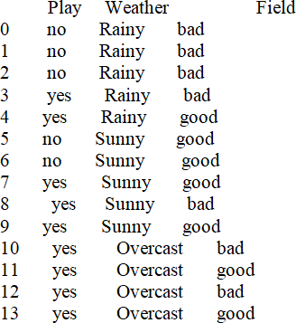 За основу возьмем данные, приведенные в предыдущем параграфе. Добавим еще одно свойство – состояние игрового поля Field. Теперь набор данных содержит два свойства (Weather, Field) и целевую колонку Play: