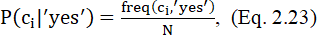 где NBI1 – вывод наивного байесовского классификатора (Naïve Bayes Inference); сi – i-e свойство или признак из F (features), влияющий на вывод классификатора. Отметим, что если P('yes')= P('no'), то первый сомножитель будет равен 1. Это означает, что если априорные вероятности исходов одинаковы, то формула упрощается к виду: