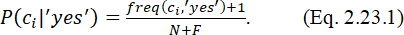 Кроме того, если некоторые признаки встречаются только в сочетании с 'yes' или 'no', то мы можем получить ошибку вывода, когда произведение обращается в ноль либо происходит деление на ноль. Третья проблема связана с тем, что оценки условных вероятностей обычно имеют небольшое значение, и если их много, то итоговое произведение может стать меньше машинного нуля. Эти вычислительные недостатки разрешаются путем сглаживания и использования суммы логарифмов вместо произведения вероятностей. Чаще всего для исключения деления на ноль применяется сглаживание по Лапласу, например, для положительной гипотезы:
