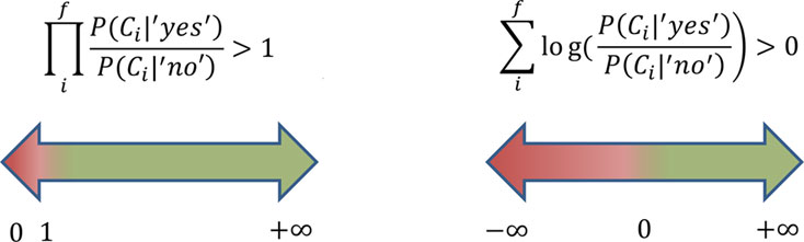 Применение логарифмов позволяет перейти от произведения отношений вероятности к суммам логарифмов этих отношений, так как log(a*b) = log(a) + log(b). Тогда вывод классификатора можно рассчитать следующим образом: