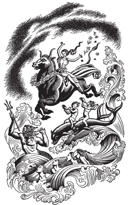 Подумала, он на спине нас покатает,Так мил и кроток он и так красив!Да разве ж это бык? Он так похож на человека,Что разве только что не говорит!С улыбкой она уселась на спину быка, но подружки, как ни торопились, не успели последовать ее примеру. А бык поднялся на ноги и со всей скоростью, на которую был только способен, устремился к берегу, а потом бросился в волны и поплыл по ним. Когда он плыл, волны, казалось, расстилались перед ним; из глубин, сопровождая его, появилась свита; диковинные морские божества, нереиды, скачущие на дельфинах, тритоны, трубящие в рога, и, наконец, сам повелитель морей, брат Зевса Посейдон.