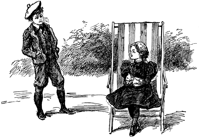 Она была точь-в-точь фарфоровая куколка, из тех, что продаются по шесть пенни за штуку. Белое круглое личико. Длинные светлые волосы заплетены в две тугие косички. Лоб выпуклый и высокий. А щёки будто приподняты кверху, образуя что-то вроде двух маленьких полочек под её маленькими синими глазами. Одета она была в смешное чёрное платьице, отделанное витой тесьмой. Высокие ботинки на пуговицах доходили почти до колен её очень тонких ног. Она сидела в кресле-гамаке, держа на руках голубого котёнка. Естественно, не голубого, как небо, а голубовато-серого, словно свеженький графитный грифель.