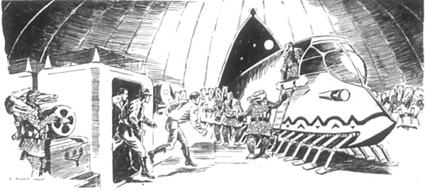 Нетренированному взгляду Рэндалла это показалось электрическим устройством очень странной конструкции, но ни он, ни Милтон, ни Ланье в тот первый затаивший дыхание момент не обратили на это почти никакого внимания. Они в зачарованном ужасе смотрели на множество существ, которые молча стояли у аппарата и у его переключателей, глядя на них в ответ. Эти существа были прямоходящими и по форме напоминали людей, но они не были людьми. Они были – эта мысль пронеслась в мозгу Рэндалла в тот полный ужаса момент – людьми-крокодилами.