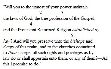 It may not be amiss, on account of the light which it will throw on this discussion, to look a little more narrowly into the matter of that oath,—in order to discover how far it has hitherto operated, or how far in future it ought to operate, as a bar to any proceedings of the crown and Parliament in favor of those against whom it may be supposed that the king has engaged to support the Protestant Church of England in the two kingdoms in which it is established by law. First, the king swears he will maintain to the utmost of his power "the laws of God." I suppose it means the natural moral laws.—Secondly, he swears to maintain "the true profession of the Gospel." By which I suppose is understood affirmatively the Christian religion.—Thirdly, that he will maintain "the Protestant reformed religion." This leaves me no power of supposition or conjecture; for that Protestant reformed religion is defined and described by the subsequent words, "established by law"; and in this instance, to define it beyond all possibility of doubt, he swears to maintain the "bishops and clergy, and the churches committed to their charge," in their rights present and future.