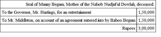 "The case is this. Mr. Goring, on his arrival here, seized all the papers, and secured them under his seal; and all the mutsuddies [clerks or accountants] attended him, and explained to him all the particulars of them. Mr. Goring inquired of me concerning the arrears due to the sepoys, &c., observing, that the nizamut and bhela money [Nabob's allowance] was received from the Company; from whence, then, could the balance arise? I made answer, that the sum was not adequate to the expenses. Mr. Goring then asked, What are those expenses which exceed the sum received from the Company? I replied, All the particulars will be found in the papers. The affair of the three lacs of rupees, on account of entertainment for the Governor and Mr. Middleton, has been, I am told, related to you by Rajah Gourdas; besides which there are many other expenses, which will appear from the papers. As the custom of entertainment is of long standing, and accordingly every Governor of Calcutta who came to Moorshedabad received a daily sum of two thousand rupees for entertainment, which, was in fact instead of provisions; and the lac and an half of rupees laid to Mr. Middleton's charge was a present on account of an agreement entered into by the Bhow Begum. I therefore affixed my seal to the account, and forwarded it to Mr. Goring by means of the Nabob."