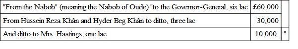 Here, I say, are the three lines that were read by a Persian moonshee. Is he a man you can call to account for these particulars? No: he is an anonymous moonshee; his name is not so much as mentioned by Mr. Larkins, nor hinted at by Mr. Hastings; and you find these sums, which Mr. Hastings mentions as a sum in gross given to himself, are not so. They were given by three persons: one, six lacs, was given by the Nabob to the Governor; another, of three lacs more, by Hussein Reza Khân [and Hyder Beg Khân?]; and a third, one lac, by both of them clubbing, as a present to Mrs. Hastings. This is the first discovery that appears of Mrs. Hastings having been concerned in receiving presents for the Governor-General and others, in addition to Gunga Govind Sing, Cantoo Baboo, and Mr. Croftes. Now, if this money was not received for the Company, is it proper and right to take it from Mrs. Hastings? Is there honor and justice in taking from a lady a gratuitous present made to her? Yet Mr. Hastings says he has applied it all to the Company's service. He has done ill, in suffering it to be received at all, if she has not justly and properly received it. Whether, in fact, she ever received this money at all, she not being upon the spot, as I can find, at the time, (though, to be sure, a present might be sent her,) I neither affirm nor deny, farther than that, as Mr. Larkins says, there was a sum of 10,000l. from these ministers to Mrs. Hastings. Whether she ever received any other money than this, I also neither affirm nor deny. But in whatever manner Mrs. Hastings received this or any other money, I must say, in this grave place in which I stand, that, if the wives of Governors-General, the wives of Presidents of Council, the wives of the principal officers of the India Company, through all the various departments, can receive presents, there is an end of the covenants, there is an end of the act of Parliament, there is an end to every power of restraint. Let a man be but married, and if his wife may take presents, that moment the acts of Parliament, the covenants, and all the rest expire. There is something, too, in the manners of the East that makes this a much more dangerous practice. The people of the East, it is well known, have their zenanah, the apartment for their wives, as a sanctuary which nobody can enter,—a kind of holy of holies, a consecrated place, safe from the rage of war, safe from the fury of tyranny. The rapacity of man has here its bounds: here you shall come, and no farther. But if English ladies can go into these zenanahs and there receive presents, the natives of Hindostan cannot be said to have anything left of their own. Every one knows that in the wisest and best time of the Commonwealth of Rome, towards the latter end of it, (I do not mean the best time for morals, but the best for its knowledge how to correct evil government, and to choose the proper means for it,) it was an established rule, that no governor of a province should take his wife along with him into his province,—wives not being subject to the laws in the same manner as their husbands; and though I do not impute to any one any criminality here, I should think myself guilty of a scandalous dereliction of my duty, if I did not mention the fact to your Lordships. But I press it no further: here are the accounts, delivered in by Mr. Larkins at Mr. Hastings's own requisition.
