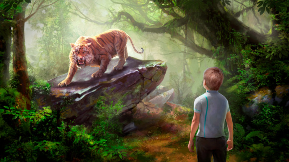 Несмотря на это, ему хочется к маме, но он продолжает шагать в направлении, обратном её голосу. Постепенно голос затихает среди деревьев. К горлу малыша неожиданно подкатывает обида, какая-то совсем непонятная Алену. Обида такая горькая, что ноги сами несут вперёд, всё дальше и дальше от дома, всё дальше и дальше в лес. Где-то на дне сознания шевелится мысль, что мама никогда не разрешала ему ходить в лес так далеко одному, но Ален снова вспоминает, что он уже большой, и больше ничегошечки на свете не боится. Ноги всё несут вперёд. Внезапно становится страшно, однако страх исчезает так же неожиданно, как и появился. Но, немного погодя, охватывает с ещё большей силой и уже не уходит. Алену очень страшно. Он один в дремучем лесу, и такой бесконечно маленький перед этой вечной мощью и величием. Кругом ни души, только огромные деревья и непролазные кусты вокруг. Мальчик озирается – как я только смог сюда пробраться? Ой, что это за чуть слышный хруст веток там впереди? Страх наваливается еще сильнее. Меж стволов мелькает чьё-то огромное рыжее в полоску тело. Хочется кричать и звать на помощь, но страх сковал тело. Сил осталось ровно настолько, чтобы стоять и ждать, вот только чего ждать, непонятно. Ален совсем недавно видел такого зверя на картинке. Он очень похож на старого кота Альпика, но гораздо больше него и, наверное, намного сильнее. И вид у него совсем недружелюбный.