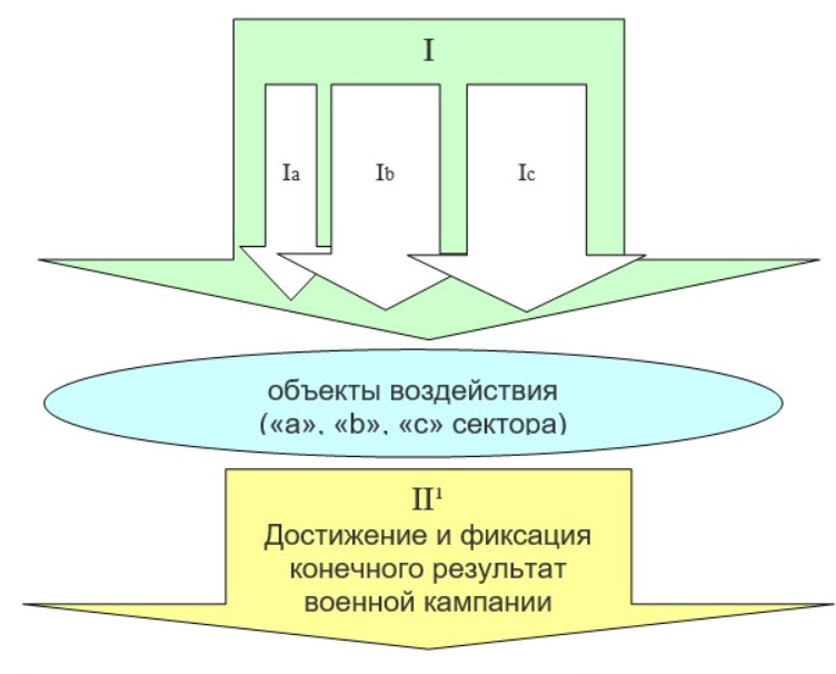 Такая схема значительно срезает общий временной отрезок противостояния, но подразумевает наличие достаточного ресурса для обеспечения параллельных действий. Более того, постоянная работа иррегулярной составляющей на перспективу в рамках подготовительных периодов, позволяет надеяться на то, что противник будет подведен к отказу от своих намерений, еще до того, как подойдет время применения очередного периода прямых действий, т.е. будет достигнута конечная цель всей кампании без полного выполнения комплекса прямых действий регулярного порядка.