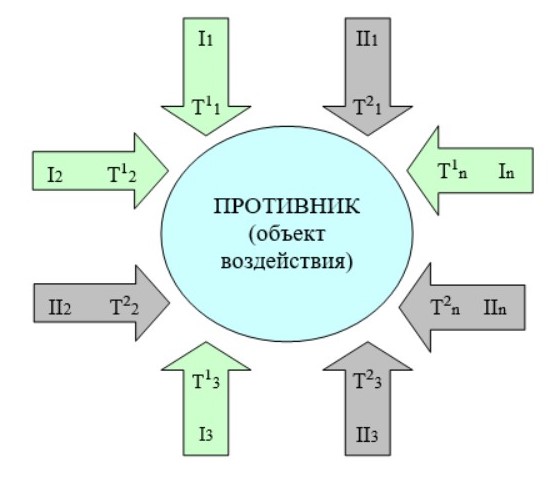 T¹1 < T²1 ≤ T¹2 ≤ T²2 … ≤ T¹n ≤ T²n – временная цепочка инициативности параллельной схемы таргетинга (проведения военной кампании), в которой: T¹1, T¹2 … T¹n – время начала воздействия подготовительных мероприятий; T²1, T²2 … T²n – время начала мероприятий прямого воздействия.