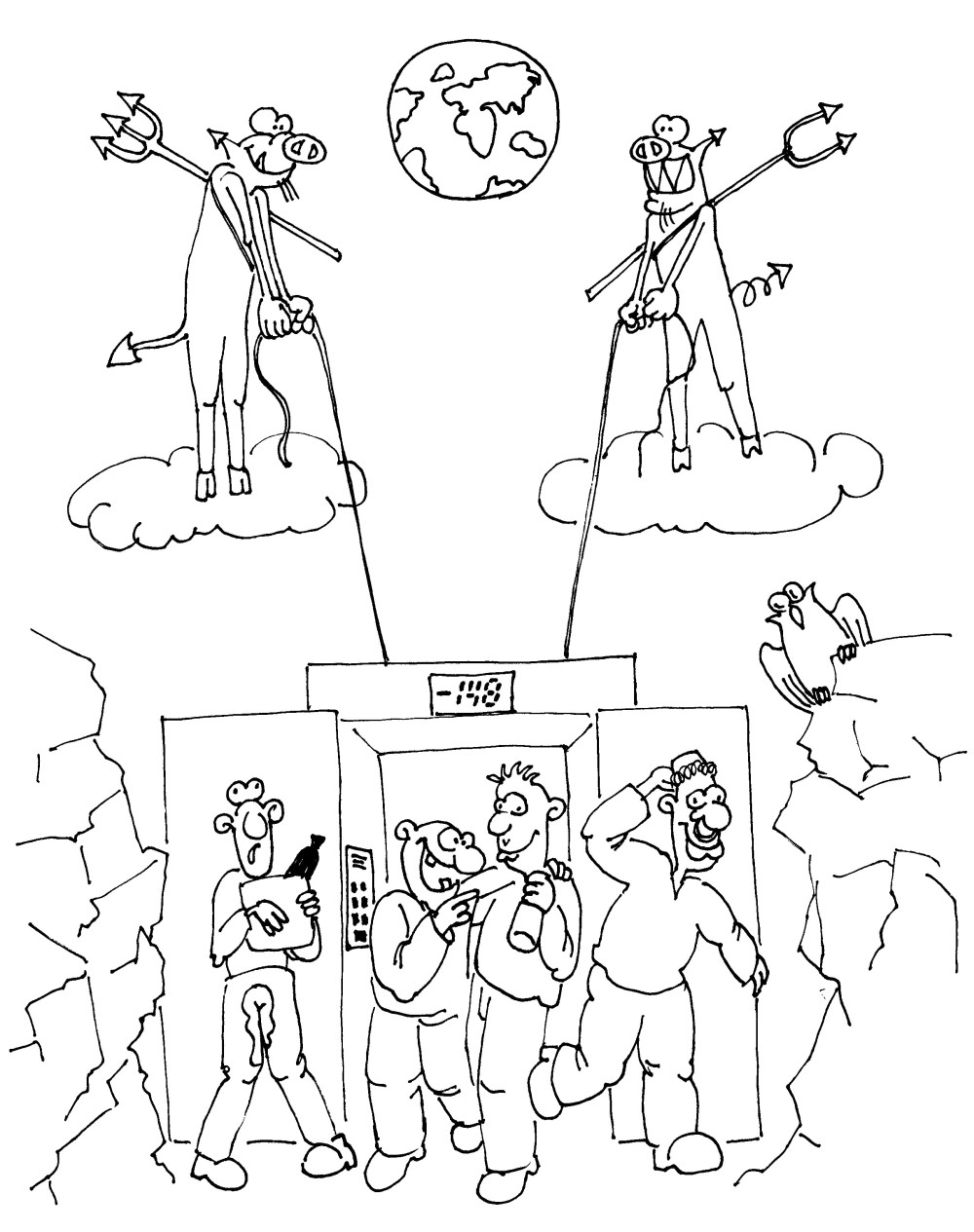 Я нажал «первый этаж», словно это была «ядерная кнопка». Лифт со скрежетом пополз вниз. Впятером в лифте было очень даже неуютно. Тусклая пыльная лампочка не прибавляла радости. Мне показалось, что мы спускаемся уже полчаса. Видимо, Якину тоже такое подумалось.
