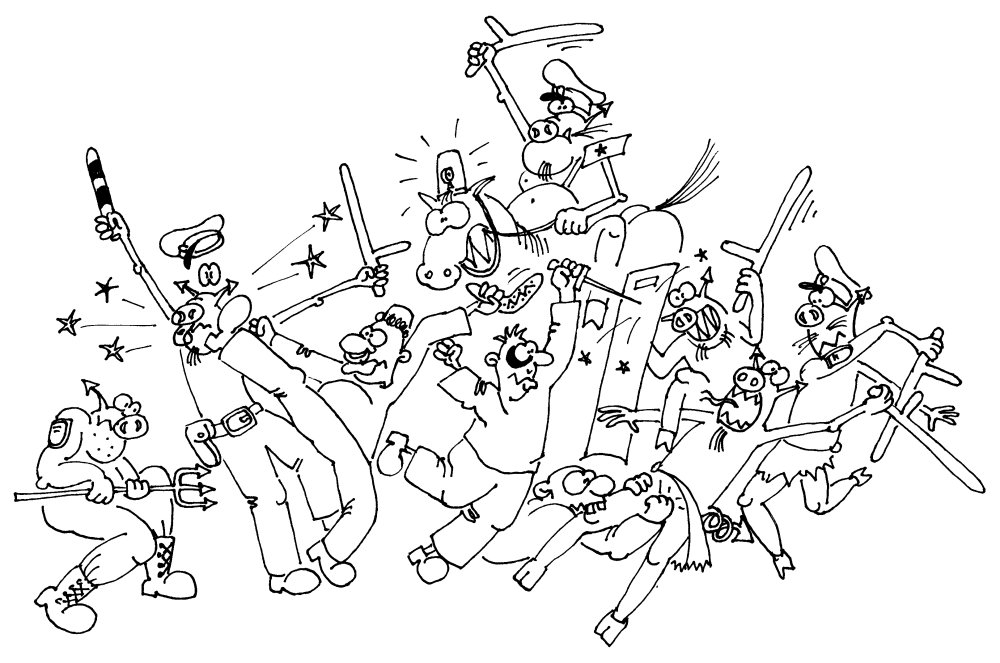 Вся свора бледнолицых уродов кинулась на нас, как пираньи на порезанный член. Мы бились, как на Чудском озере наши предки супротив псов-рыцарей. Негр расшвыривал когтистых мразей, словно лев шакалов. Вот это школа! Грохотов рубился огромными кулаками и вокруг него стоял хруст и уханье. Я работал «пером», как на хорошей цыганской свадьбе. Якин даже кусался. Один только снабженец якобы упал в обморок. Его сразу куда-то унесли.