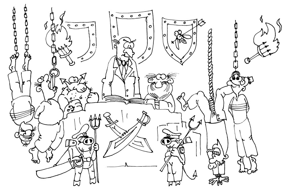Наконец, в зале произошло какое-то движение. Горбуны встали со скамей и повернули свои морды к кафедре. В глубине сцены, прямо под противоестественной фигурой-декорацией, открылась маленькая дверца и в зал вошли четыре интересных персонажа.