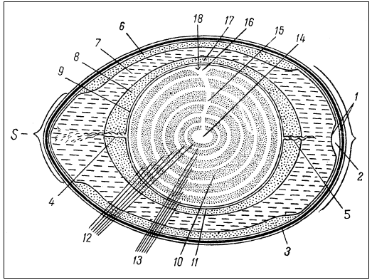 Рис. 1. Схема строения куриного яйца: 1 – подскорлупные оболочки; 2 – воздушная камера; 3 – скорлупа; 4, 5 – градички; 6 – наружный жидкий слой белка; 7 – средний плотный слой белка; 8 – средний жидкий слой белка; 9 – внутренний плотный слой белка; 10 – желток; 11 – желточная оболочка; 12 – слои желточного желтка; 13 – слои светлого желтка; 14 – латебра; 15 – шейка латебры; 16 – ядро Пандера; 17 – желточная оболочка; 18 – зародышевый диск
