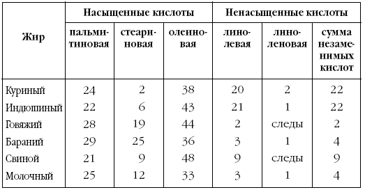 Качество мяса обусловлено не только количеством жира, но и соотношением отдельных жирных кислот. Известны рекомендации медиков, особенно сторонников натурального питания, об ограничении потребления продуктов, содержащих жиры, которые способствуют накоплению холестерина в организме человека и отложению его на стенках кровеносных сосудов, что в конечном итоге ведет к сердечно-сосудистым заболеваниям – инфаркту и инсульту. Однако при этом, как показали последние исследования, большое значение имеет не столько потребление самого жира, сколько соотношение в нем насыщенных и ненасыщенных жирных кислот. Именно насыщенные жирные кислоты опасны с точки зрения повышения содержания холестерина в крови и отложения его на стенках сосудов, а ненасыщенные жирные кислоты способствуют его выведению из организма человека. В этом отношении жир птицы выгодно отличается от жира других сельскохозяйственных животных (табл. 2).